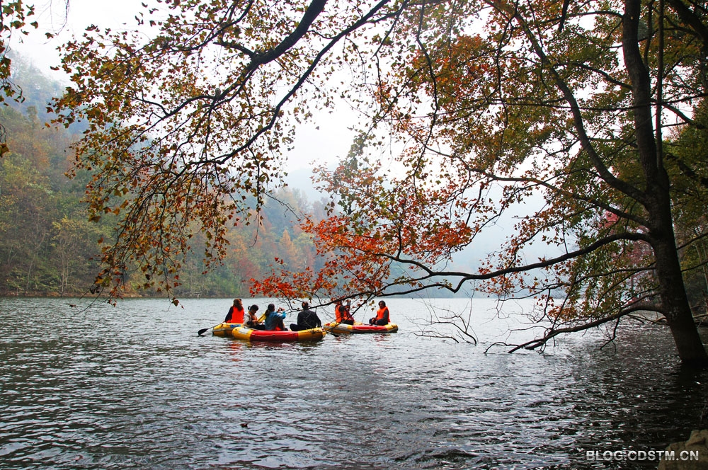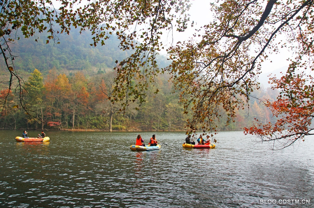 我曾于2011年12月11日上午去过上岗水库,当时天气甚好。拍了些片,中午11点多回县城用午餐(水库离县城只有6公里),打算下午再去拍,后因出一点意外,没能如愿,非常遗憾。2012年12月8日,又和双口、随手拍、淡淡素妆、心蕊等几位再度去一睹其风采,租了皮划艇“钻”进库叉里,饱览枫水相连的别样风光,并写下了一首诗——