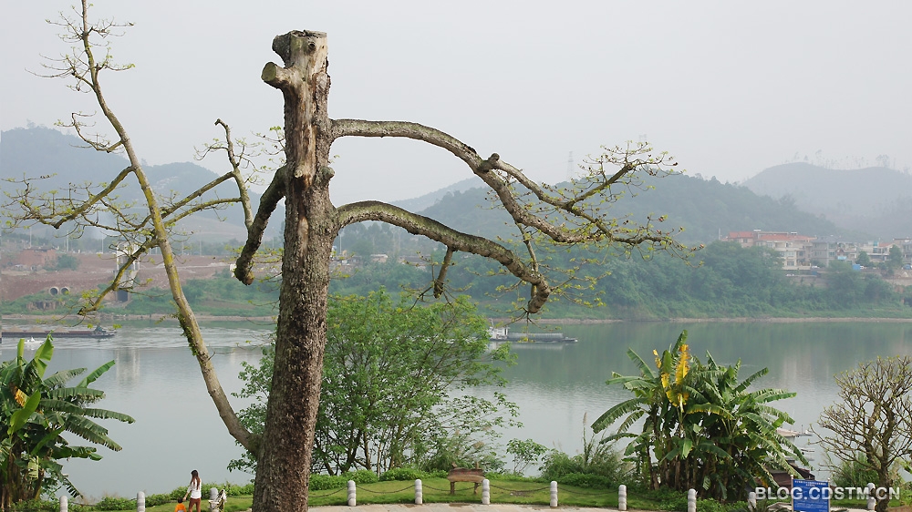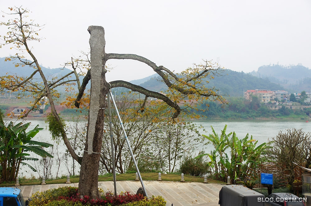 2014-03-12 16:00:37近年来,我隔年去“朝拜”它一次,每次去都看到有变化。2010年3月27日见到它时,虽已被斩头断臂,但主干的树皮还基本完整(图2)。2012年4月8日见到它时,虽然仍然抹红吐绿,但主干已局部出现脱皮(图3)。俗话说,人怕伤心,树怕剥皮(因为树是靠皮输送营养的),树皮脱落,意味着好景不长。2014年3月9日,为给南宁市老年大学摄影系6班外拍踩点,我第三次踩自行车去柳沙,想看看那株老木棉是否开花。可能是天气的原因,花还未开,最大的变化是主干树皮脱落严重,园林工作者用水泥糊上加固,并用金属柱子支撑(图4)。不知它还能撑多久,是否会重蹈南湖101号老榕树走上不归路的覆辙?