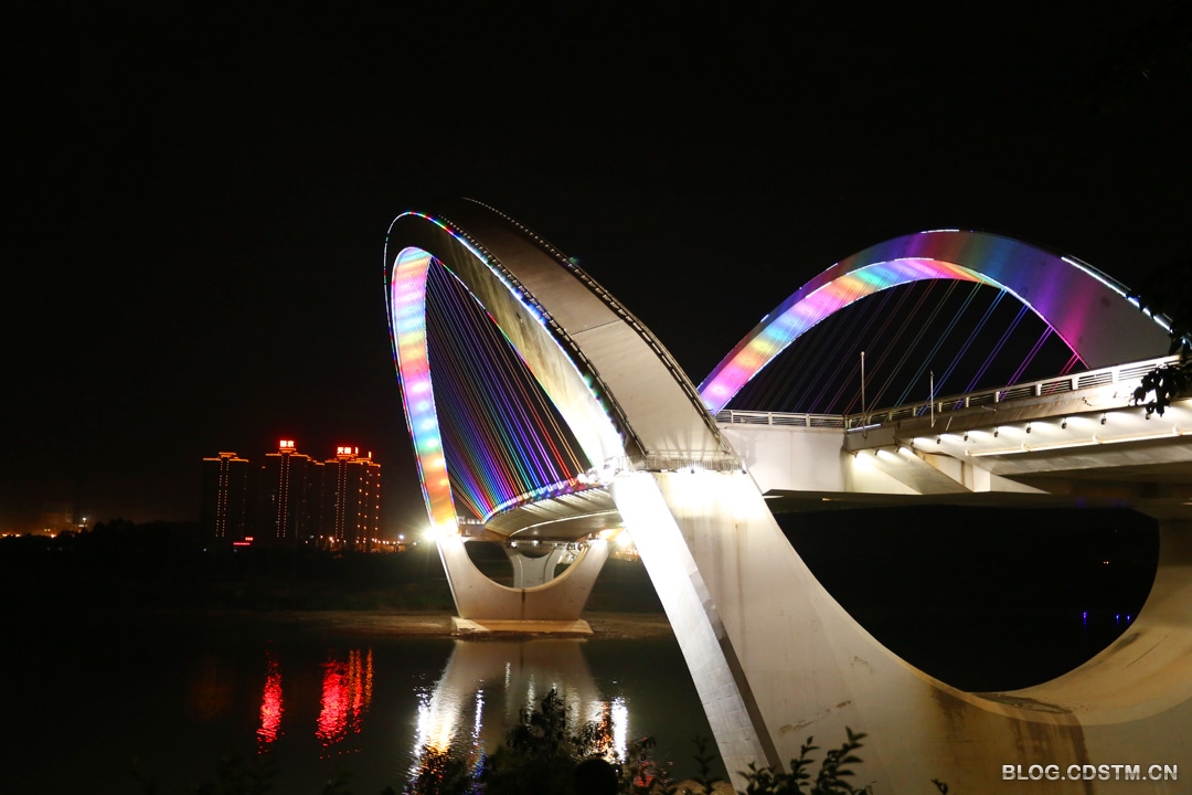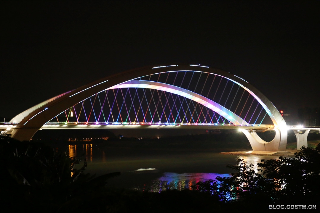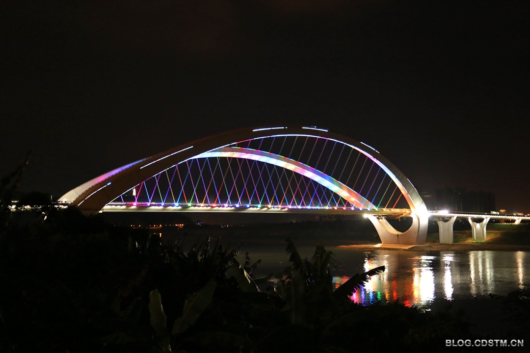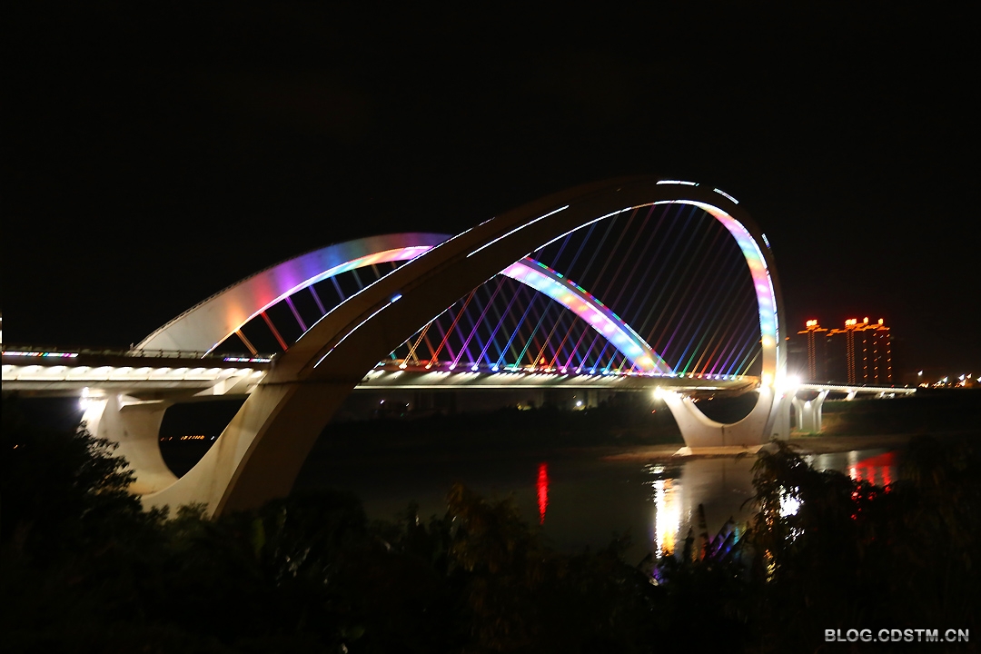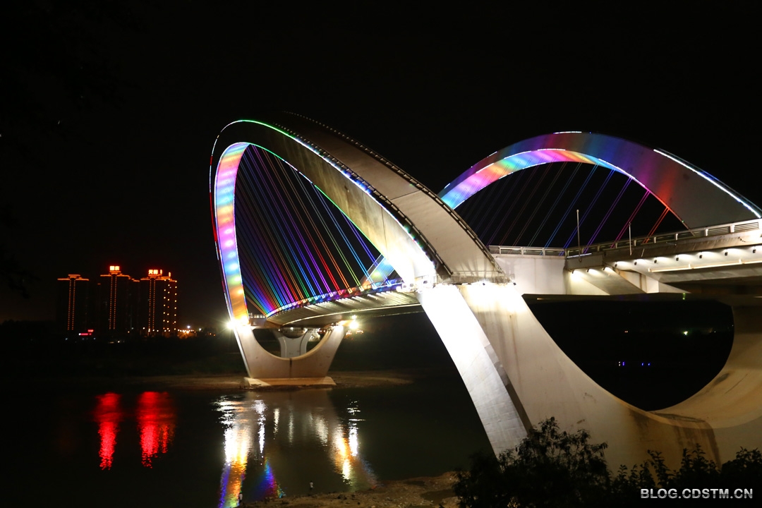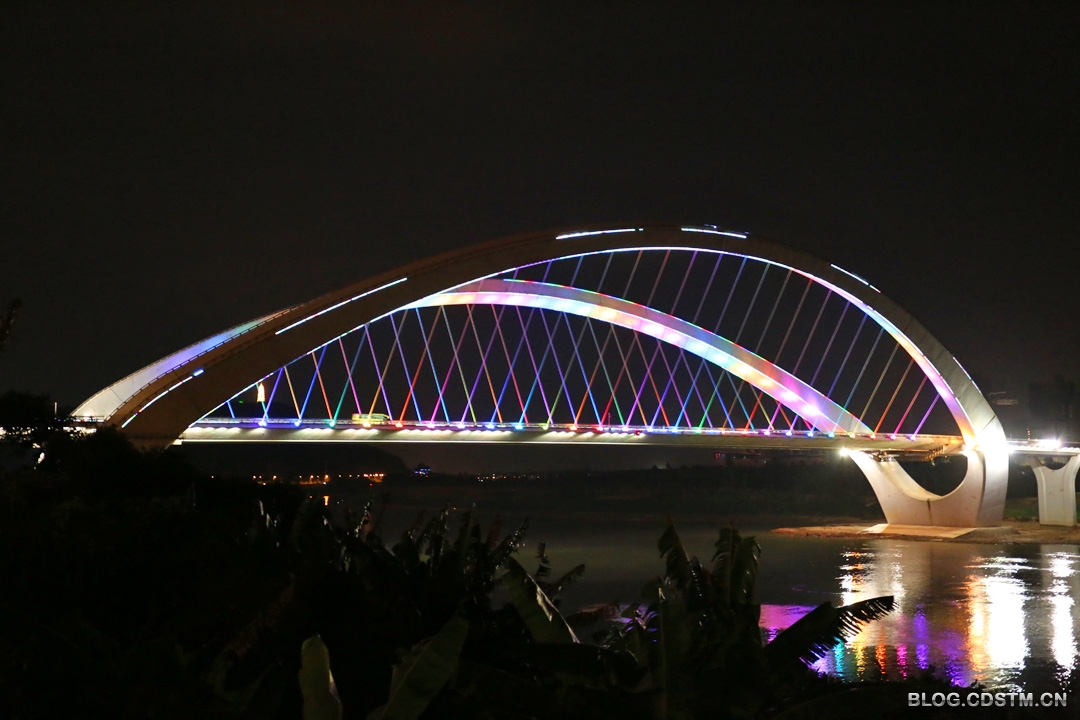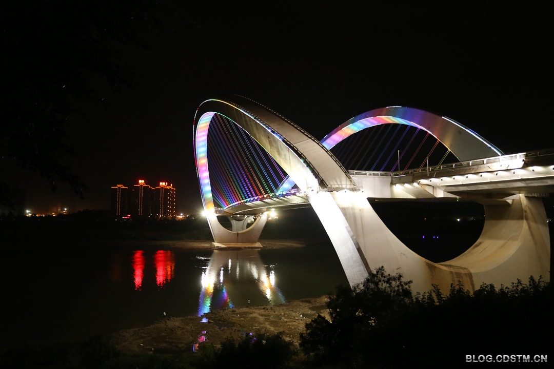 2014年5月26日晚,我和南宁市老年大学摄影系6班的几位同学去离大桥不远的五象湖拍晚霞回来经过这里时,用佳 能6D拍了几张大桥夜景图,没用脚架,调高感光度。用恒定光圈4,速度前4张1/20秒,后3张1/30秒,感光度前4张为6400,后3张为4000。