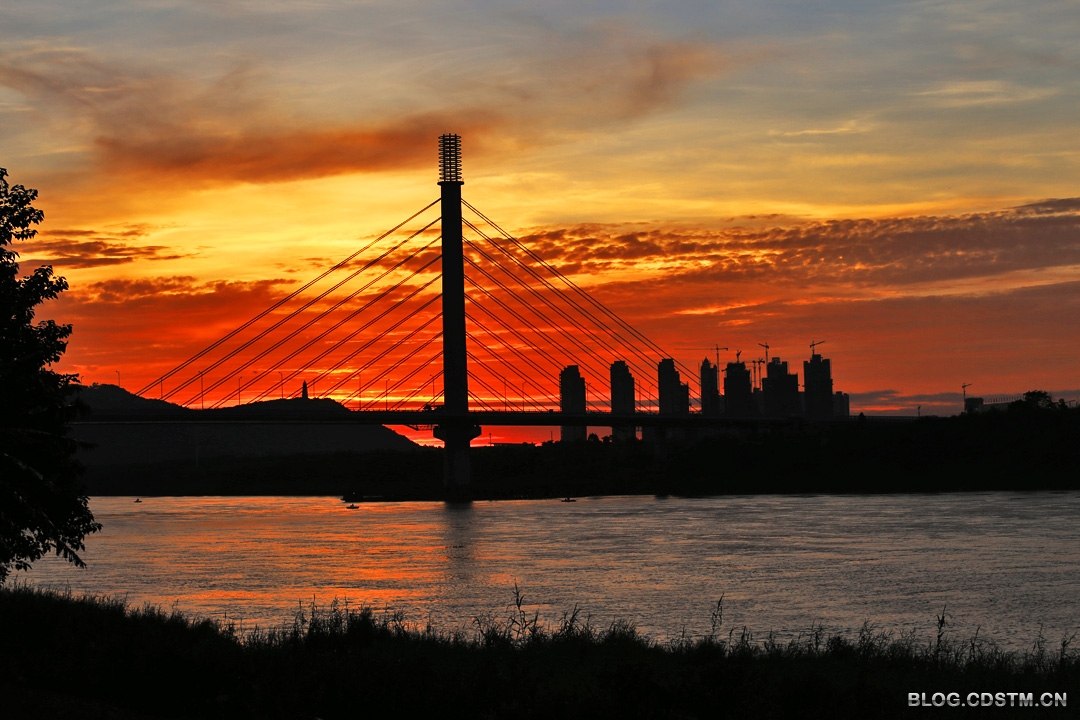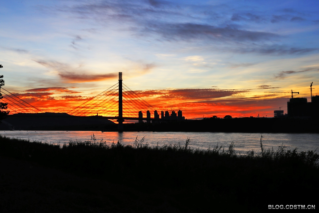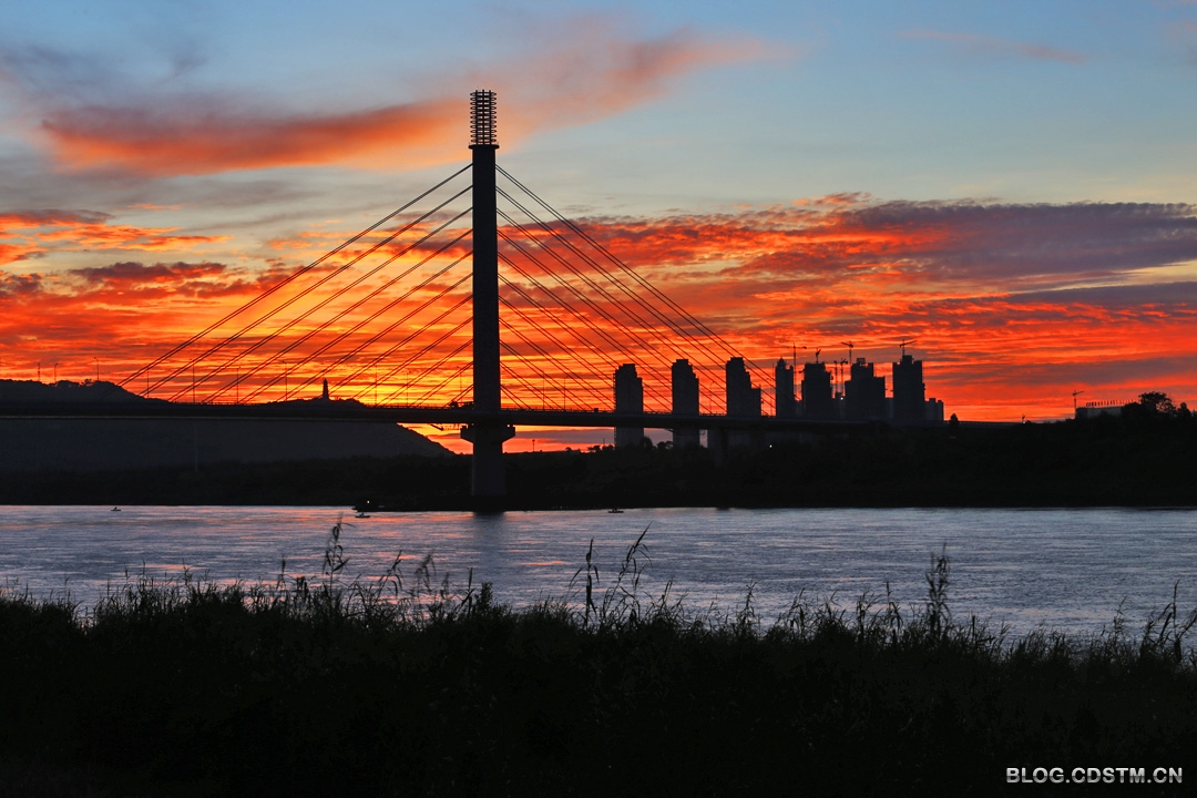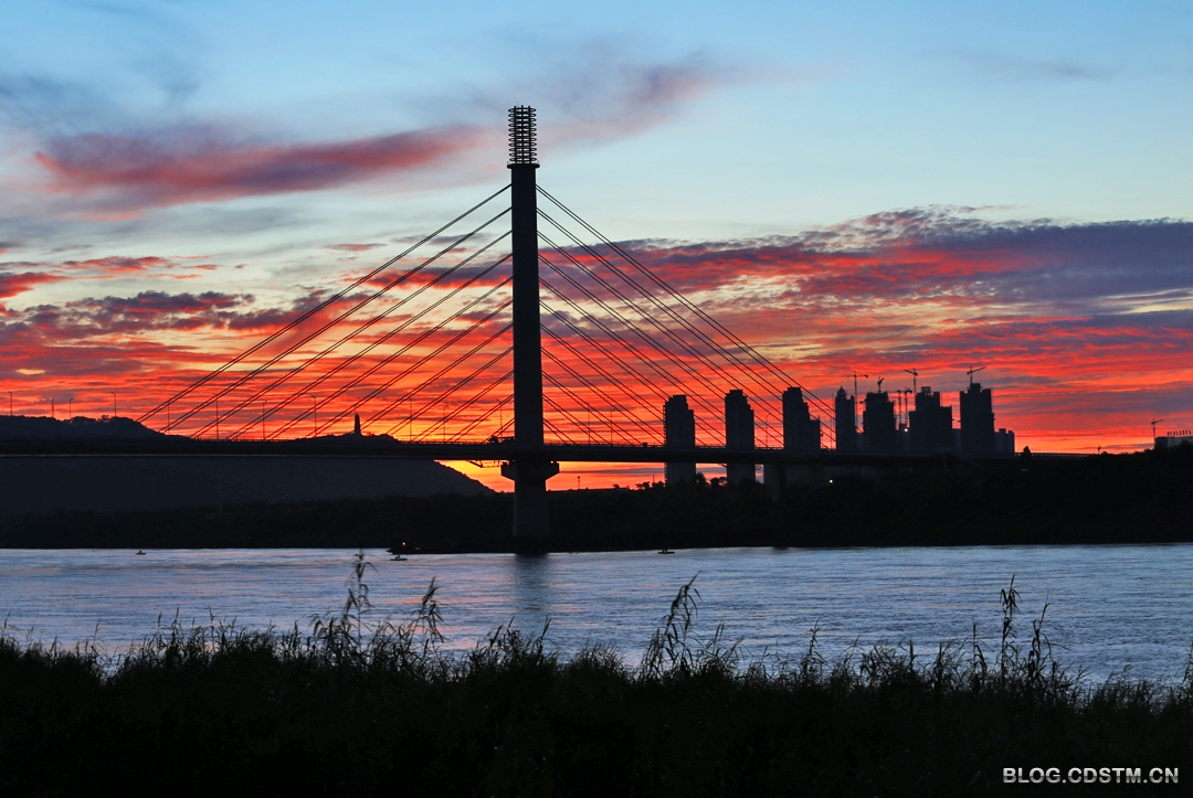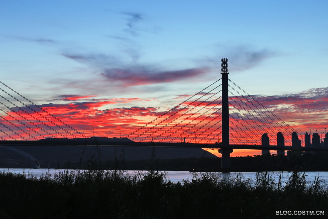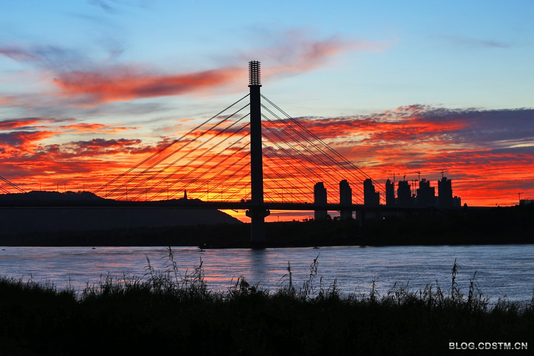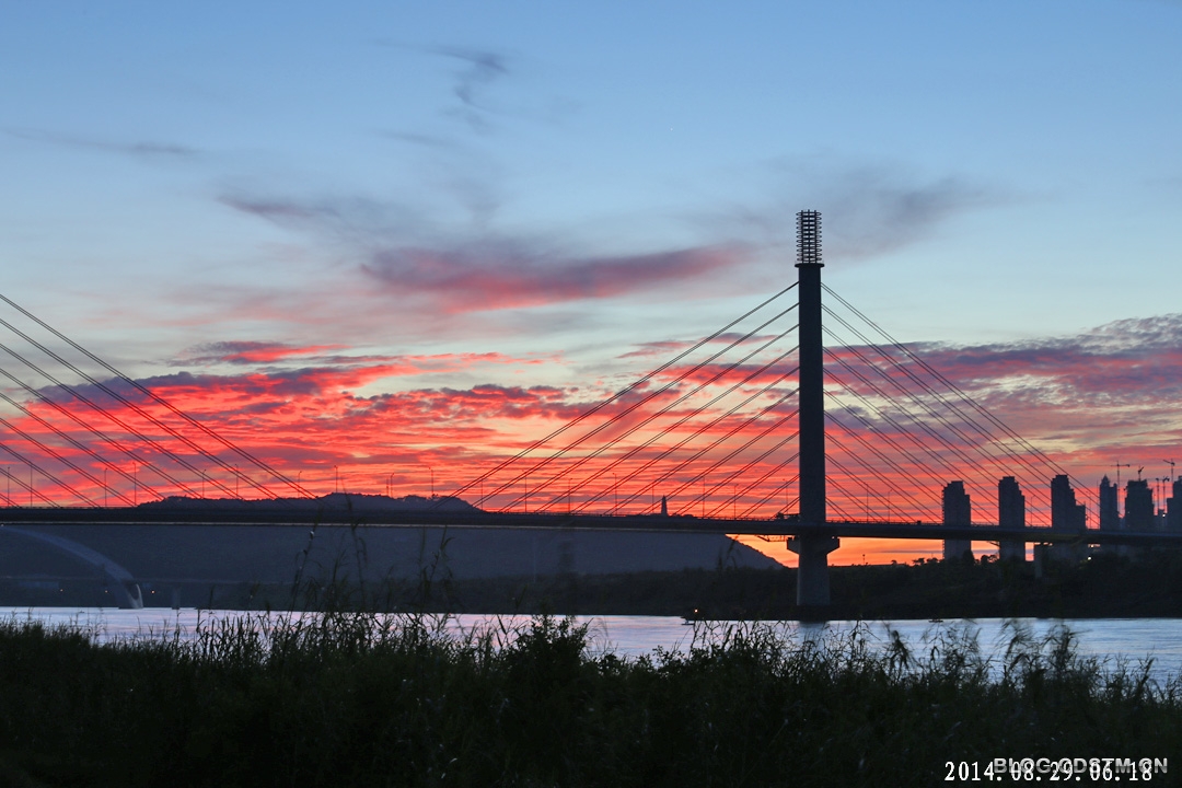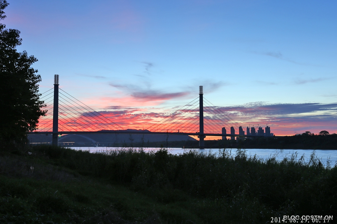 我曾数次跟踪南宁五象大桥的建设。据说明天(8月30日)大桥将通车,今天天还没亮,我就骑上双轮”宝马“,费时50分钟,赶到柳沙,正赶上朝霞抹红时。本想下到江边拍片,但因近期多雨,岸边的地很烂,下不去,未能看到大桥的全貌,只好在稍高一点的岸边拍照。江岸长有很多类似芦苇的芒草,这些芒草挡住了部分视野,江面显得不开阔,影响效果,有点遗憾。