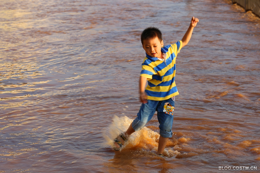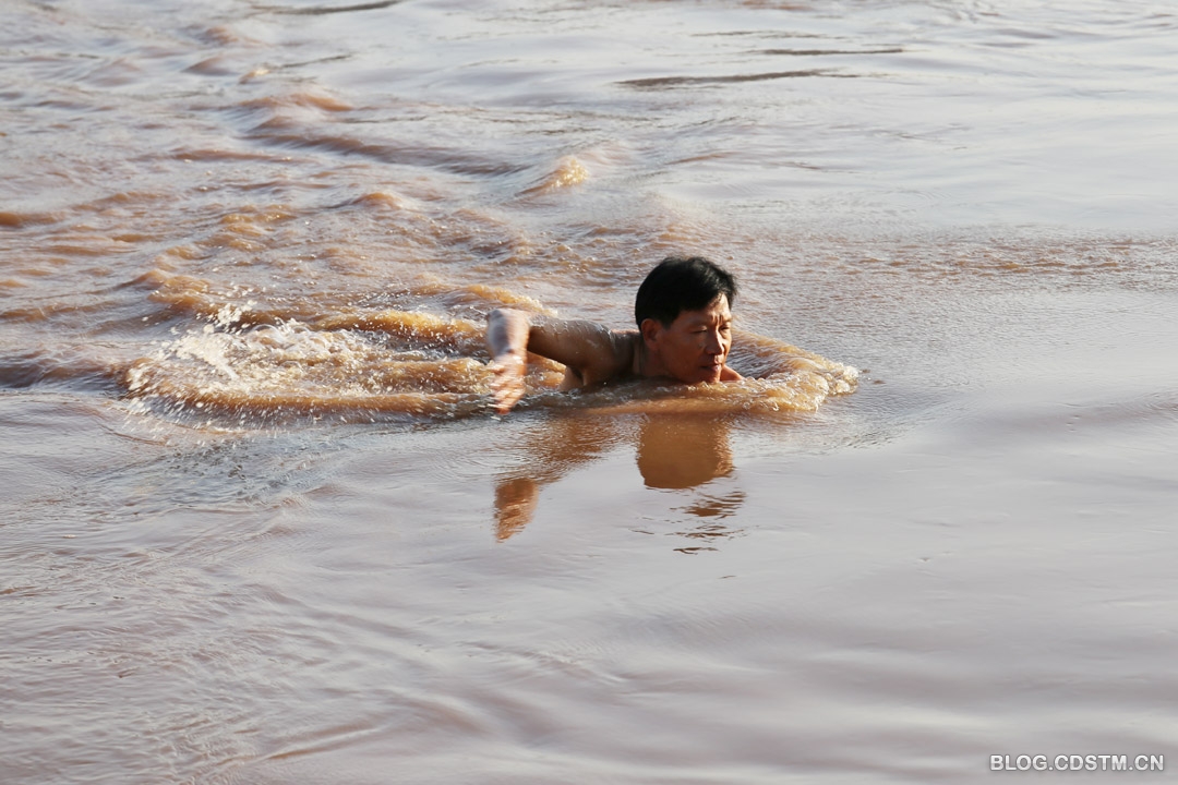 由于有了防洪堤的保护,市 民不再担惊受怕,从容生活。他们或到洪流中击水,或下网捕鱼,或观光嬉戏,一派祥和的景象。