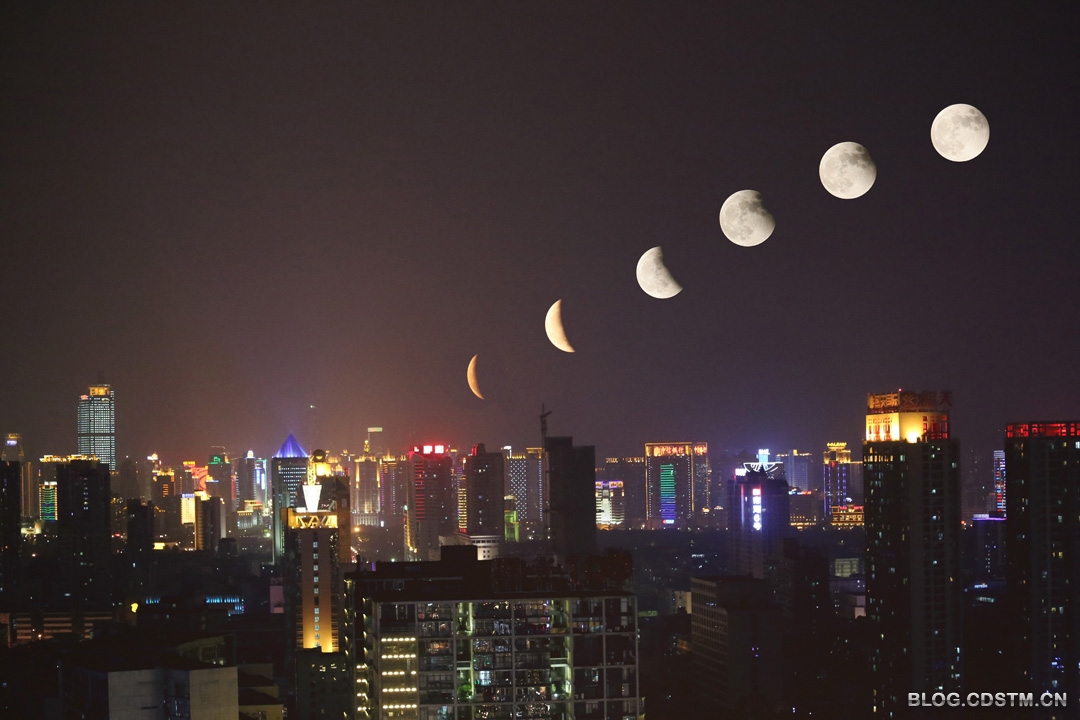 2014年10月8日的月全食,因南宁霾太重,19点40分以前看不到月亮,更谈不上红月亮了。直到19点45分才看到一细小淡黄色弯月,20点52分,月亮完全复原。这是由7张图组成的月全食进行曲。