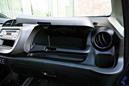 宽敞的车内空间为人性化装备提供了舞台。位于前排乘客席前的储物盒与空调系统相通,在炎热的夏季可以通过空调的冷气实现类似于冰箱的作用,这种功能在很多小型车上已经被应用,但本田并不满足于此,一些高端车型上配备的副驾驶席前储物盒带制冷功能也被应用在新飞度上。更令人欣喜的是遍及全车的丰富储物空间,只要你愿意,新飞度随时可以变成一个移动“水吧”——全车所有的杯槽、杯架大约能够存放16瓶饮料。