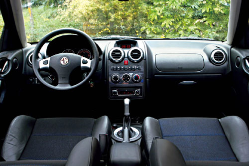外观已是如此怪异,内饰又会带给我怎样的惊喜呢?MG3 SW的深色内饰首先赢得了我的好感,运动基因就应该表现在够酷的视觉冲击上。3辐式方向盘、橙色背光的仪表盘、蓝黑双色搭配的真皮桶型座椅、亮银饰件的适度点缀甚至连自动变速器换挡杆都被做成传统手动变速器的样式,MG3 SW运动的决心不言而喻。中控面板上的各种按键被简单地码成一排,简洁易用,不过四个车窗的电动升降按键与206采用同样位置,使用起来不太方便。