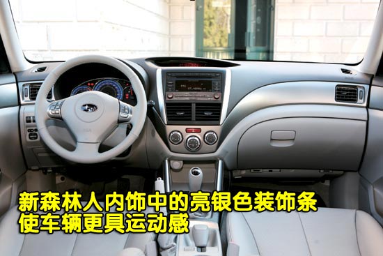 和上一代产品所追求的硬朗、简约不同,新森林人的内饰设计更多的运用了弧形线条,两条明显的飞翼状亮银色装饰条突出了车辆的运动感与时尚气息,此外,浅色系的明暗颜色搭配以及柔软的皮质座椅,为内饰添色不少。中控台顶端增设了多功能行车电脑显示功能,时间、车外温度以及瞬时油耗等数据一目了然。