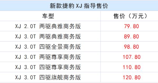 2015-12-09 16:33:23日前,我们从捷豹官网获悉,在广州车展上亮相的新款XJ已经公布了售价,新车共推出六款车型,售价区间为79.80万-120.80万元,详细售价请见下表: