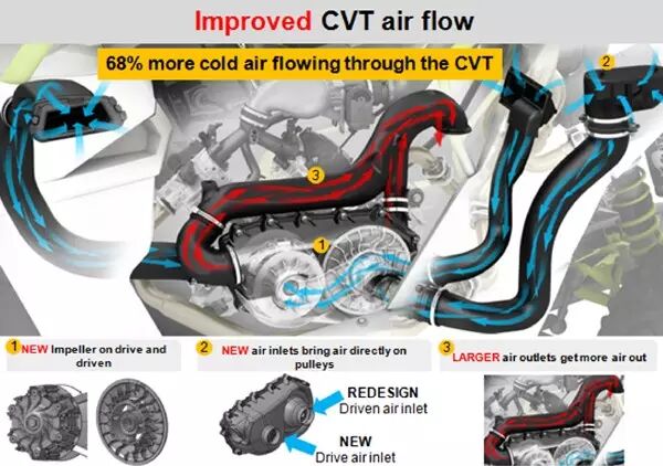 动力提升的涡轮增压发动机上还装配了CVT(无级变速)系统,该系统经重新设计,由全新的QRS(快速反应系统)以及升级版主动轮驱动,减少了摩擦,提供瞬时反应,配以最优化的皮带夹。全新CVT系统进口和出口的叶轮进行了调整,使进入皮带轮的冷却气流增加了68%。