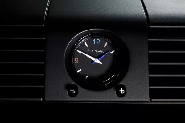 车辆内部采用了黑色真皮搭配蓝色撞色缝线,同时还有很多细节设计隐藏其中。例如,手套箱内部印有一串钥匙的图案,车顶上有一只手绘的蜜蜂,这些细节以诙谐幽默的方式展现出了英国乡村文化以及路虎卫士的经典传承。带有Paul Smith招牌设计元素的时钟也替换了路虎传统的中控台时钟。