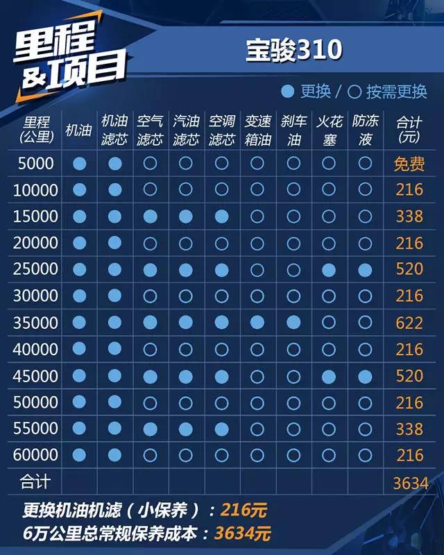 宝骏310的质保期为5年或10万公里,首保里程为5 000公里,并且厂家赠送一次免费保养。小保养每次216元,6万公里总常规保养成本3 634元,再算上加油费和保险,每年的养车开支约合9 181元,实在是不贵。而和大部分厂家不同的是,宝骏310的养车方案非常灵活,除了要求按照里程更换机油和刹车保养外,空气滤芯、空调滤芯和汽油滤芯均是先进行检查,并不强制按照里程更换。