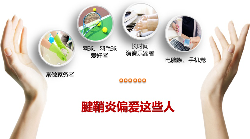 很多疾病都是懒出来的,但腱鞘炎是个例外,它专对勤快的人下手,比如常做家务、打网球或羽毛球、演奏乐器、电脑族、手机党等手部活动比较多的人。此外,怀孕后期的准妈妈及产妇也比较容易患腱鞘炎,这与她们体内的激素变化有一定关系。