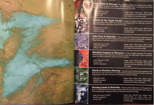听说了西瓜最近在认字母,工作人员专门推荐了一本《太空里的字母书》(ABC from Space: A Discovered Alphabet),这本书的作者是美国国家航天局(NASA)地球观测台网站的科技作家,他某次偶然发现加拿大上空的一个云团的形状特别像字母V,于是在卫星云图上开始搜集各种地球照片,形状跟字母类似的水文地貌、云团等等,出版了一本图片字母书。比如下图左侧像Z的字母,实际上是卫星拍摄的2013年11月26日,美国上空横跨科罗拉多、堪萨斯、俄克拉荷马、新墨西哥和德克萨斯五个州的暴风雪降雪图。右边则是解释各个字母拍摄的地点和时间。这对读绘本的小朋友来说,是个很好的天文地理启蒙。