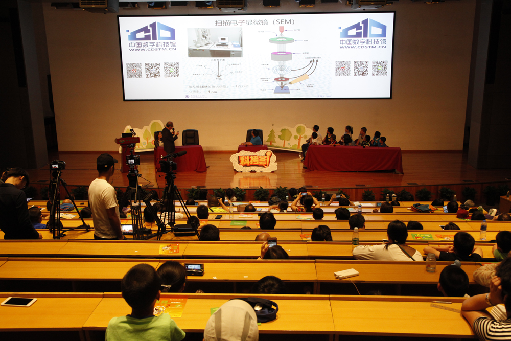 在众人的期待下,张锦平研究员开始详细地向大家解释观察纳米结构的手段——电子显微镜,以及应用纳米结构服务于人类的方法,如纳米碳管、纳米触手等等,还向大家展示了纳米材料已经被应用或未来可能被应用到的各个领域。提问环节科拷团和台下的小朋友们提出了各式各样的应用纳米结构的设想和问题,张锦平研究员和薛进女士都一一加以认真回应,并鼓励小朋友们带着问题成长学习、发明创新。最后张锦平研究员热情地欢迎在场的小朋友们将来去中科院苏州纳米所参观学习。