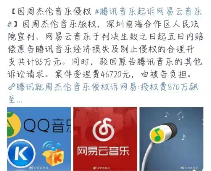 这一举动很快引起了大家的注意,不少网友发出质疑,网易云音乐此举是否有打擦边球之嫌?且不论这件事是否符合与版权方的约定,单就最后一天还要捞一笔的行径就颇有“背水一战”的架势,而这件事也引发了作为直接拥有周杰伦歌曲版权的杰威尔音乐公司的不满,腾讯音乐娱乐集团作为版权代理方决定就此事起诉网易云音乐,2019年11月,中国裁判文书网公布了腾讯音乐娱乐科技(深圳)有限公司与杭州网易云音乐科技有限公司、杭州乐读科技有限公司录音录像制作者权权属纠纷一审民事判决书》,深圳前海合作区人民法院判决网易云音乐于判决生效之日起五日内赔偿原告腾讯音乐经济损失及制止侵权的合理开支共计85万元。