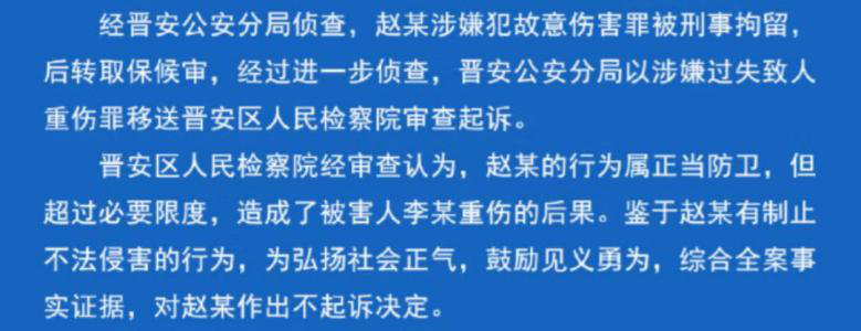 这样的通报并不足以服众,3月1日,福州公安再次发布通报,修改了前一个不起诉决定的说法:“福州市人民检察院对晋安区人民检察院就赵宇见义勇为一案的处理作出纠正,认定赵宇的行为属于正当防卫,依法不负刑事责任,对赵宇作出无罪的不起诉决定。”
