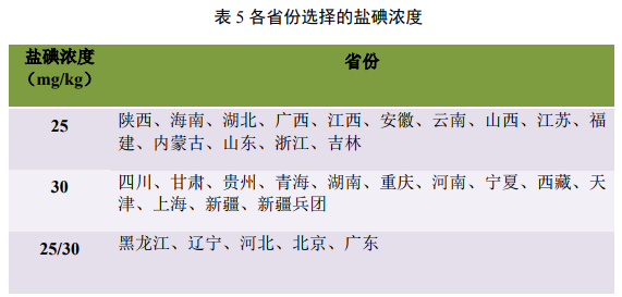 加碘食盐是用碘酸钾或碘化钾按一定比例与普通食盐混匀而成。2012年,我国颁布新的《食用盐碘含量》(GB26878-2011)标准,规定食用盐产品(加碘食盐)中碘含量的平均水平(以碘元素计)为20g-30mg/kg,允许±30%的波动范围。目前,14个省、自治区选择的加碘食盐浓度为25mg/kg;12个省、市、自治区及新疆兵团选择的加碘食盐浓度为30mg/kg;5个省、市选择25mg/kg和30mg/kg两个浓度的加碘食盐,其中25mg/kg加碘食盐供一般人群食用,30mg/kg供妊娠妇女、哺乳妇女等特需人群食用。