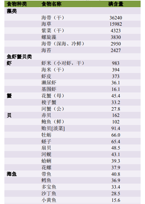 食物中碘含量水平(mg/100g 可食部)(详细可参考上文链接《指南》附录)