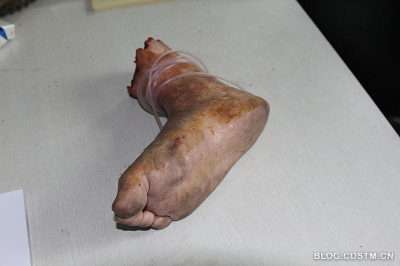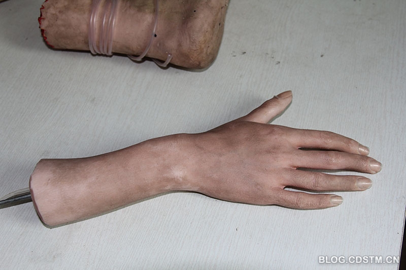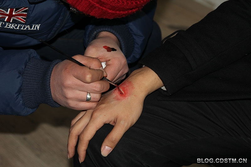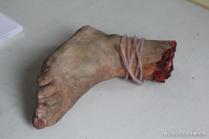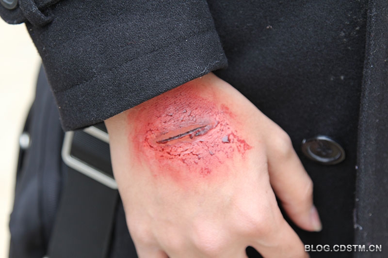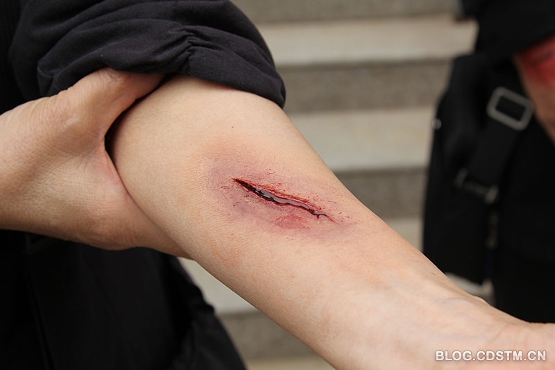 今天去采访影视特效化妆,我们体验了一下,让他们给我们做了逼真的伤口。我的同事把图片发给女朋友看,谎称自己受伤了,结果把女朋友吓哭了,估计晚上要跪搓衣板了