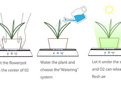 这款增氧器可以帮助绿色植物产生更多的氧气,从而达到清新室内空气的目的。将浇好水的植物盆栽放到增氧器的底座上,把它们放到晒得到太阳的窗台上,增氧器就会开始工作。增氧器通过吸收水分,让水分加速渗透土壤,以此促进植物的光合作用,让植物制造更多的氧气。