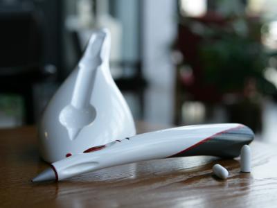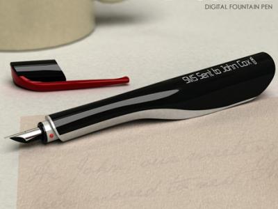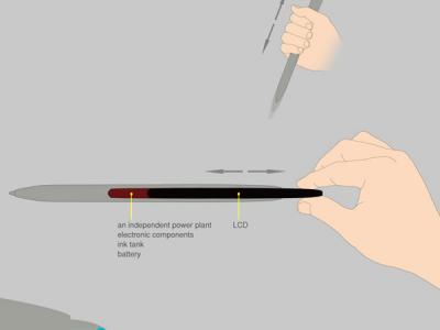 这可不是一支普通的钢笔,而是一支通过书写来发短信的数码笔。它通过蓝牙把你书写的内容传送到手机或电脑上,发送信息时,只要按下笔头的红色按钮即可。一旦信息发送完成,状态就会显示在笔身的显示屏上。