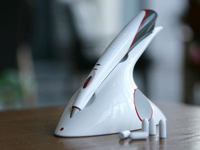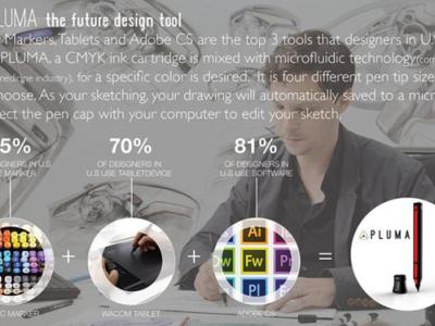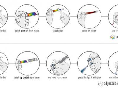 这支笔内置一个彩色墨盒,你可以在笔杆上选择颜色,还可以选择不同尺寸的笔尖。按压笔尖会喷射出墨汁,你就可以像使用普通画笔一样在纸上作图。它不仅可以自动将草图保存到存储卡中,把笔帽与电脑连接后,还可以把草图传输到电脑中,利用电脑完成绘图。