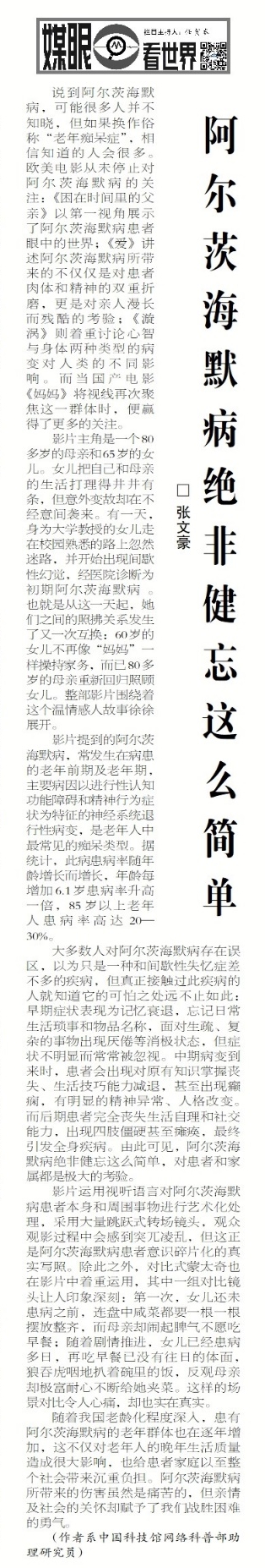 影片提到的阿尔茨海默病,常发生在病患的老年前期及老年期,主要病因以进行性认知功能障碍和精神行为症状为特征的神经系统退行性病变,是老年人中最常见的痴呆类型。据统计,此病患病率随年龄增长而增长,年龄每增加6.1岁患病率升高一倍,85岁以上老年人患病率高达20-30%。