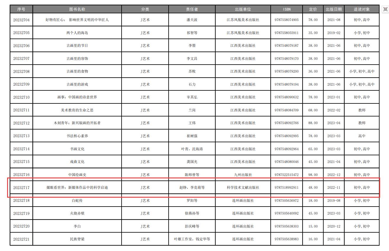 近日,教育部公布2023年全国中小学图书馆(室)拟推荐书目,《媒眼看世界:新媒体作品中的科学启迪》成功入选。
