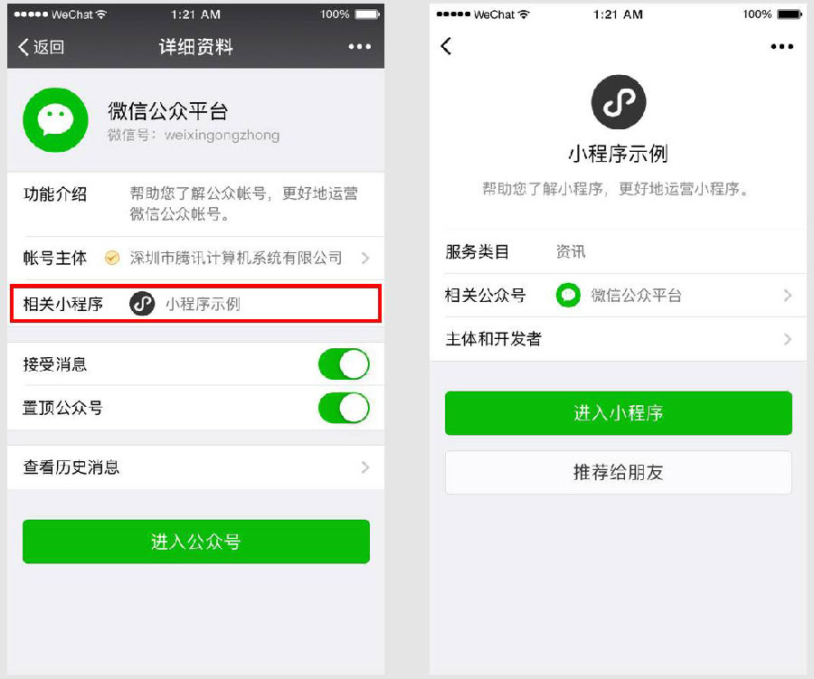 4.公众号:有些公众号开发了小程序,这些小程序可以在公众号资料里看到,点击即可进入相关小程序。