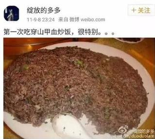 有一些中国人,认为穿山甲的肉很美味,他们不顾穿山甲是国家重点保护野生动物的事实,宁可犯法,也要尝尝鲜。他们还把吃穿山甲当成一件值得炫耀的事情发布到网上。他们难道不知道,自2017年1月1日起,根据新版的《中华人民共和国野生动物保护法》,不仅是捕杀和交易国家重点保护野生动物的人会受到法律制裁,为食用而购买国家重点保护野生动物及其制品的人也会被处罚吗?