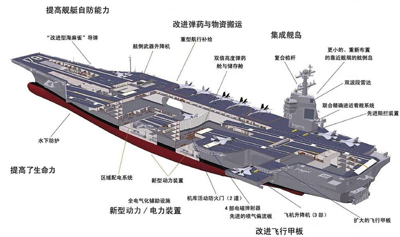 其中,最具代表性的是电磁弹射器、先进阻拦装置、联合精确进近着舰系统、新型核反应堆和双波段雷达。