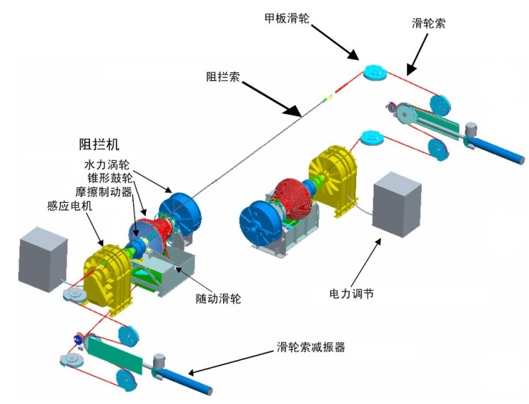 “福特”级航母放弃了液压阻拦装置,采用由水力涡轮、感应电机和摩擦制动器作为吸能部件的先进阻拦装置。该装置具有构成简洁、可靠性高等优点,可对阻拦过程实施精确控制,阻拦过载小,有利于延长飞机寿命。