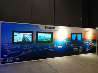 沿着序厅向里走,就进入了展览的主体部分,第一个映入眼帘的展项就是我们国家一项举世瞩目的创新性工程——港珠澳大桥,展项以展板及电子屏的形式对港珠澳大桥的相关内容进行展示。