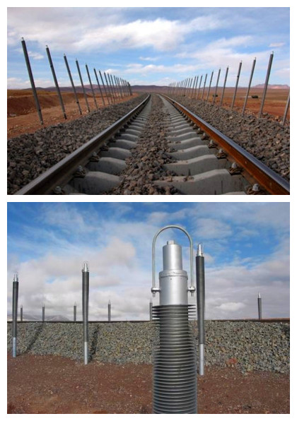 热棒这一结构采用液氨作为工质材料,地下部分5米,地面露出2米,热棒下部的液氨温度较低,能够吸收路基中多余的热量。液氨吸热后会汽化,由于体积膨胀,会向热棒顶端移动。热棒顶端露出地面,并装有散热装置,由于空气温度较低,加之蒸气压的作用,氨将热量散至空气中,自身重新变为液态回流至管底。通过汽化液化过程的循环,热棒不断将路基的热量散至空气中,保护了青藏高原冻土的稳定。