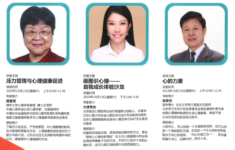 本次“心理健康周”活动由中国科学技术馆与北京市卫生和计划生育委员会及中共北京市委社会工作委员会共同策划开展,活动主场在中国科技馆,时间为10月9日至14日。别看活动只有短短6天的时间,“科学含金量”着实不低,单看活动在心理健康名师大讲堂中邀请的这些业内大咖,也足以令人心向往之了。