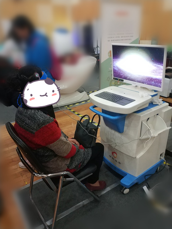 坐下之后,会有一位小姐姐帮忙在你的头上戴上一条测量带,然后认真听从电脑指令就可以啦,如下图阿姨所示: