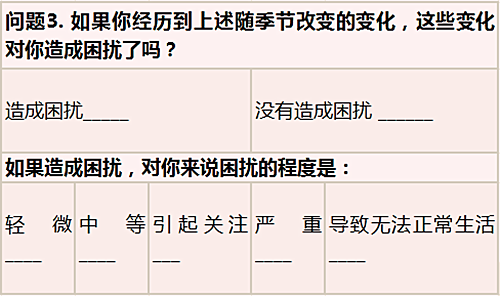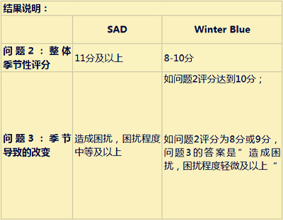 由Rosenthal和他的同事在1984年编的SPAQ(Seasonal Pattern Assessment Questionnaire)问卷被广泛应用于诊断SAD中。这一问卷包含6个题目,可免费下载并自主测试。通过回答问题2和问题3,可快速判断出自己是否属于SAD或Winter Blue。