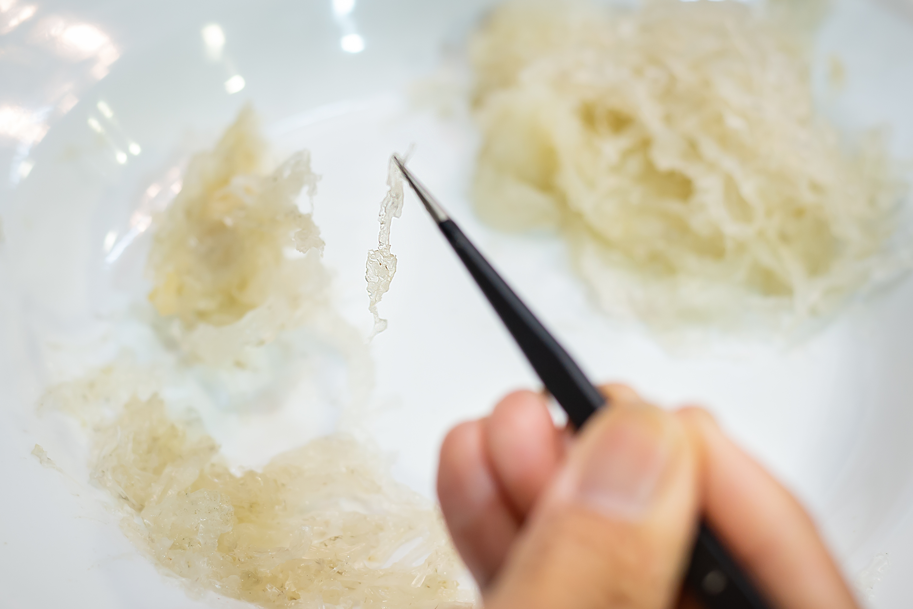 另一方面,采摘后的燕窝并不能直接入口。前面提到了,金丝燕筑巢的材料里除了唾液,还有绒毛、草叶、植物茎秆等。需要经过分拣、消毒、挑毛、检测等一系列繁琐又细致的工作,才能食用。这无疑会耗费大量人力、物力。