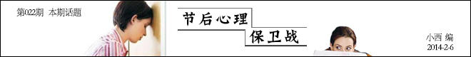 导语: 热热闹闹的马年春节已经接近尾声,不论您是回家团圆还是外出旅游,节日期间的“三多”——饭局多、应酬多、活动多,肯定是少不了的。经过七天的放松与娱乐,面对即将到来的工作日和学习日,估计不少人都遇到了“假期综合症”和“上班恐惧症”等心理问题。本期《微专栏》,小编就为您梳理这许多“症”的特点以及相应的解决方法,助您打一场完美的节后心理保卫战,元气满满地迎接2014年。