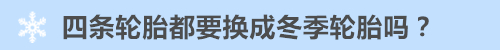 应把四个轮胎都换上同一规格、厂牌、结构、花纹的冬季轮胎。如果只安装2条冬季轮胎会出现以下的情况:只在前轮安装冬季轮胎,将会导致车辆后轮抓地力不足,汽车在冬季路面行驶时容易造成转向过度或刹车甩尾;只在后轮安装冬季轮胎,将会导致车辆前轮抓地力不足,汽车在冬季轮面行驶时容易产生转向问题。