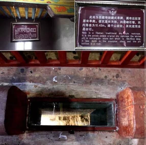 建在布达拉宫山腰上的这个厕所已有三百余年的历史,虽然和布达拉宫1300年的历史相比,不算古迹,但它的存在足以使布达拉宫的故事更加奇特。它海拔3700米,是世界上海拔最高的厕所,也是世界上落差最大的厕所,落差达60米,相当于一幢二十层的高楼。