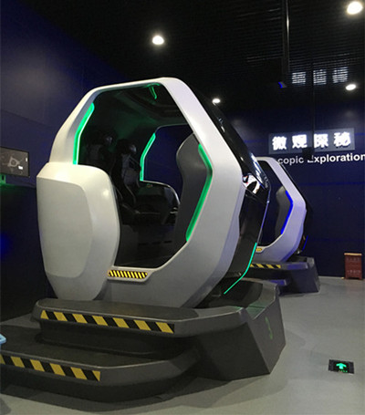 展厅里名为“微观探秘”的展品包含VR座椅和VR眼镜以及不同内容的VR体验场景。VR座椅像一个水滴舱,体验者坐在舱内,戴上VR眼镜,不仅在视觉上能获得逼真的虚拟体验,还能体验到运动过程中的模拟风感和动感,让整个虚拟旅程更加真实、生动。体验者还能通过水滴舱内的控制摇杆,与VR内容进行一定的交互。