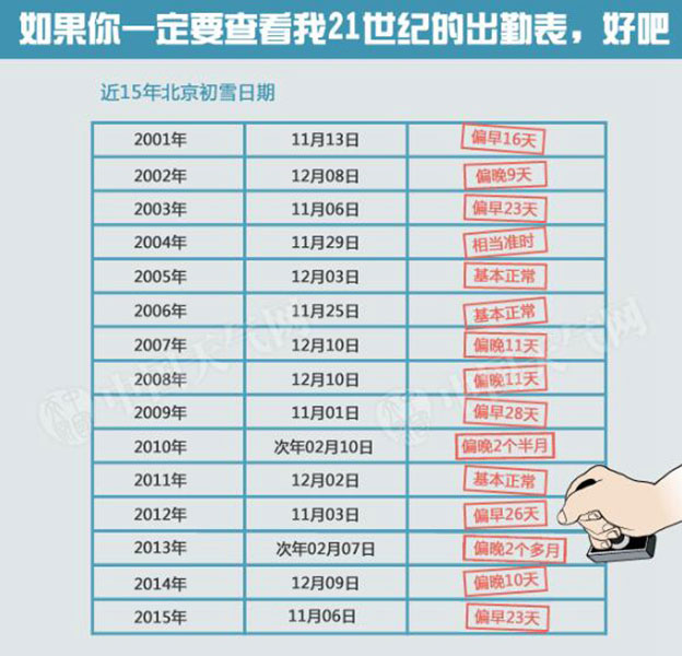 东方学姐:感觉近年来,不仅初雪来得晚,而且每年的降雪量也越来越少,事实是这样吗?