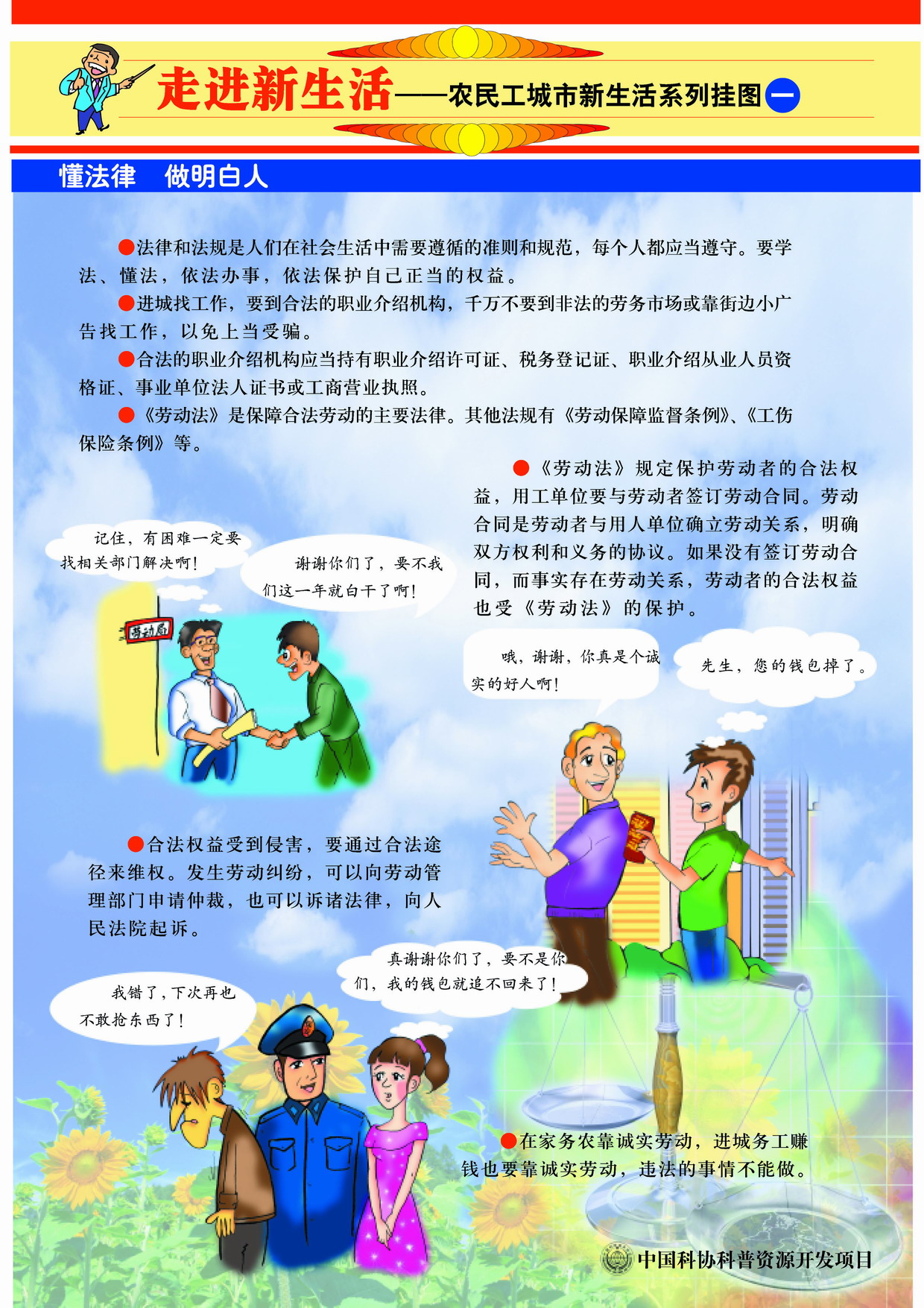 本套挂图从懂法律做明白人、学文化做文明人、会生活做精明人、强身体做健康人和保安全做放心人五个方面反映农民的城市新生活。