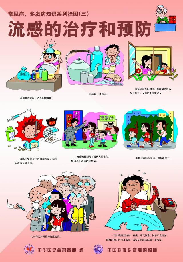 常见病防治这套科普挂图共8张,分别是卫生防病、家庭消毒、流行性感冒不可轻视、流感的治疗和预防、病毒性肝炎科学治疗重在预防、现代结核病控制策略、认识"非典"、"非典"防治。
