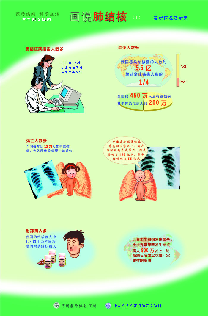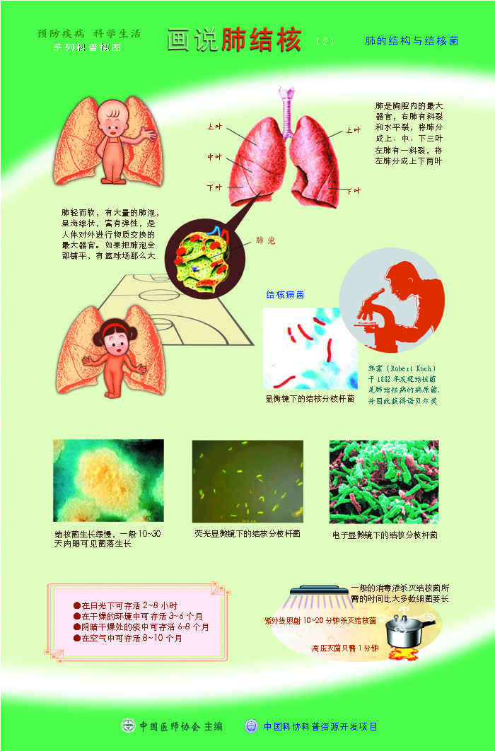 画说肺结核这套科普挂图共8张,分别是肺的结构与功能、肺结核病是怎样传播的、肺结核病的发病情况及危害、及时发现肺结核、如何预防肺结核、肺结核的诊断治疗、肺结核患者的衣食住行。