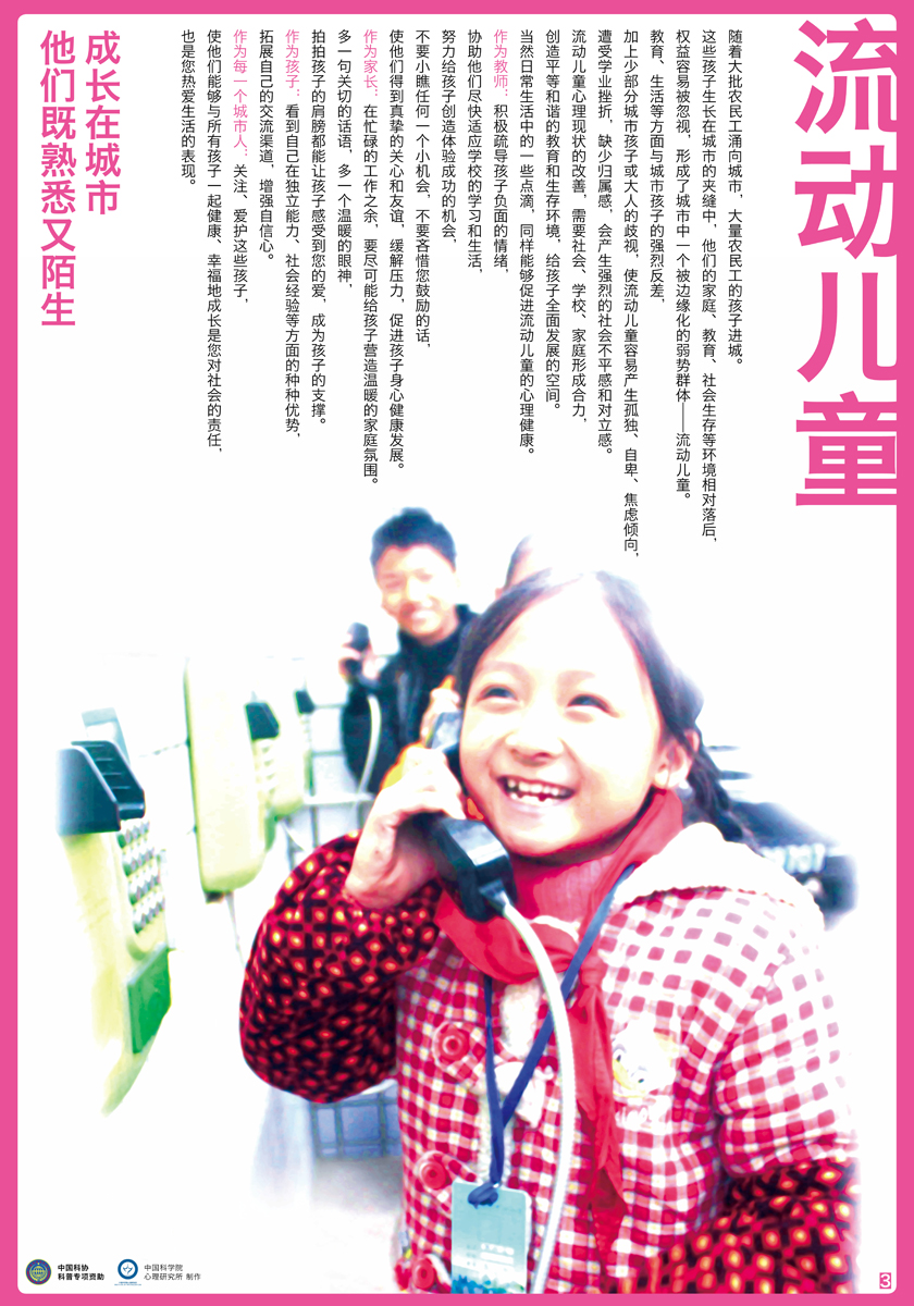 随着大批农民工涌向城市,大量农民工的孩子进城。这些孩子生长在城市的夹缝中,他们的家庭、教育、社会生存等环境相对落后,权益容易被忽视,形成了城市中一个被边缘化的弱势群体--流动儿童。