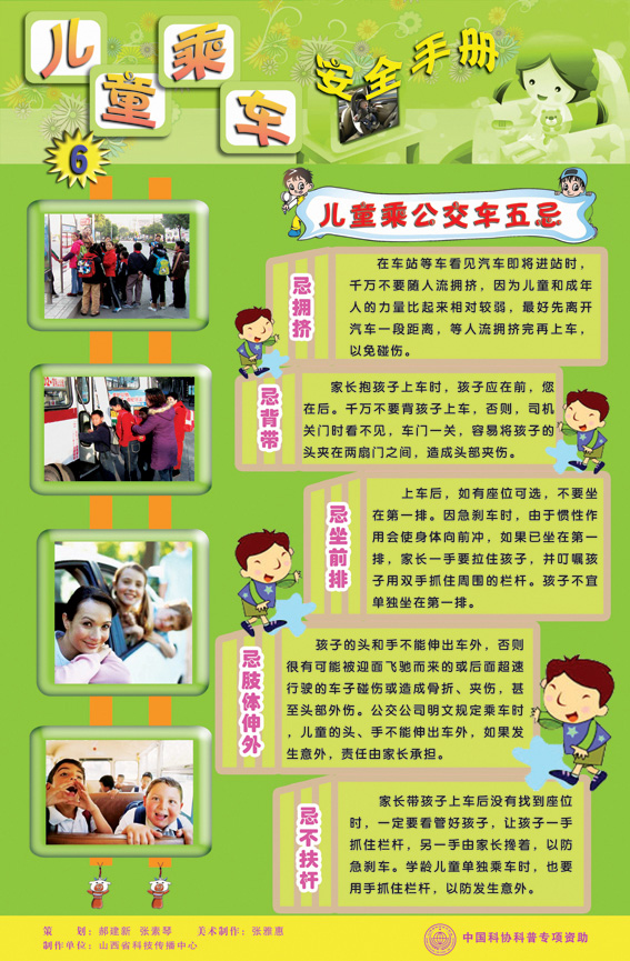 儿童乘车公交车五忌保护儿童权益这套科普挂图共14张,分别是中国未成年人保护法和所有的儿童都享有的《儿童权益公约》,分别是儿童享有生存权、健康权、发展权、受教育权、受保护权、参与社会权。