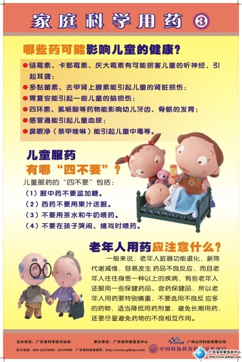 本套挂图介绍了家庭科学用药的方法,如何分清理解药品说明书上"慎用"、"忌用"和"禁用";口服药是饭前服还是饭后服;老年人、孕妇和儿童用药要注意些什么。