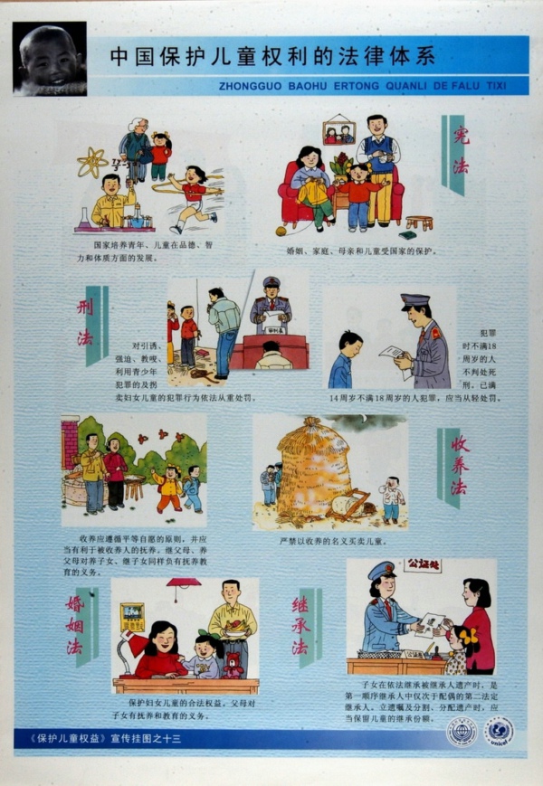 保护儿童权益这套科普挂图共14张,分别是中国未成年人保护法和所有的儿童都享有的《儿童权益公约》,分别是儿童享有生存权、健康权、发展权、受教育权、受保护权、参与社会权。