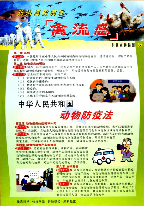本套挂图包括总则、动物疫病的预防、动物疫病的控制和扑灭、动物和动物产品的检疫、法律责任等。