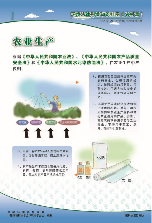本套挂图共十张,包括:农业生产、畜禽及水产养殖、公民的环境权益、如何寻找环境维权方面的律师、如何收集和保留必要的证据、如何在计算在环境诉讼中受到的损失、大气污染维权、水污染维权、固体废弃物污染维权、第三人责任。